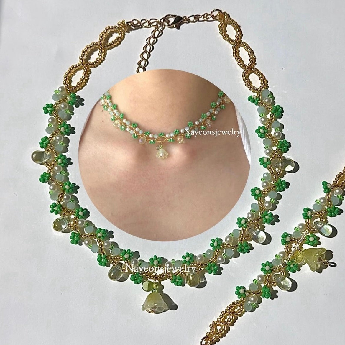 - handmade with pearls, pressed glass, Czech, crystal beads, stainless steel chain, stainless steel eye pin, glass flower bead.