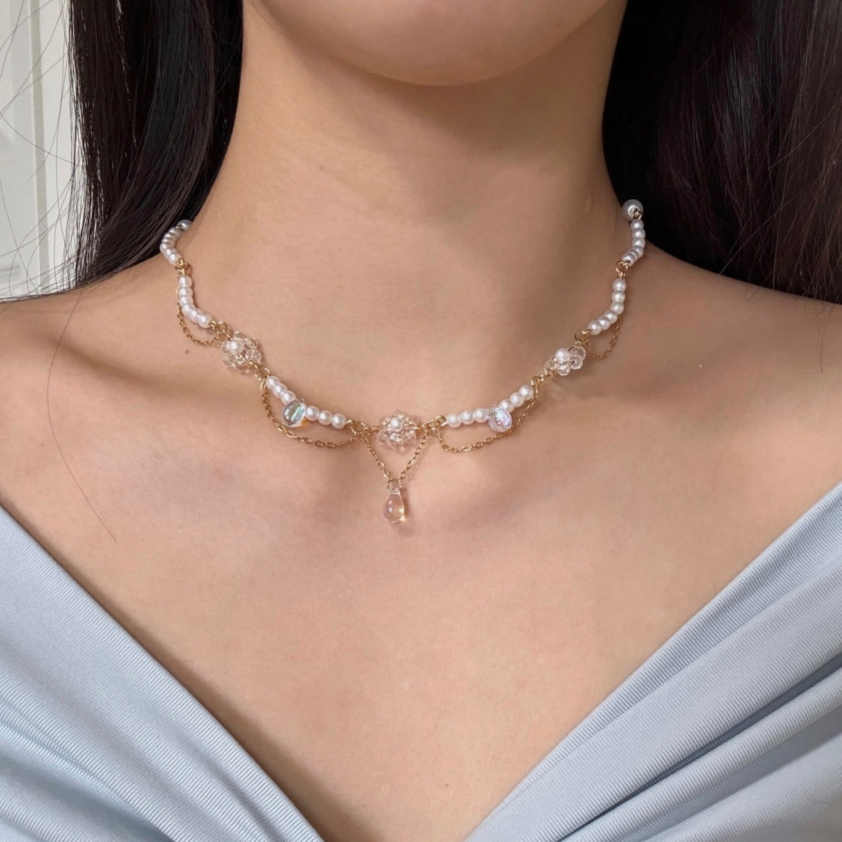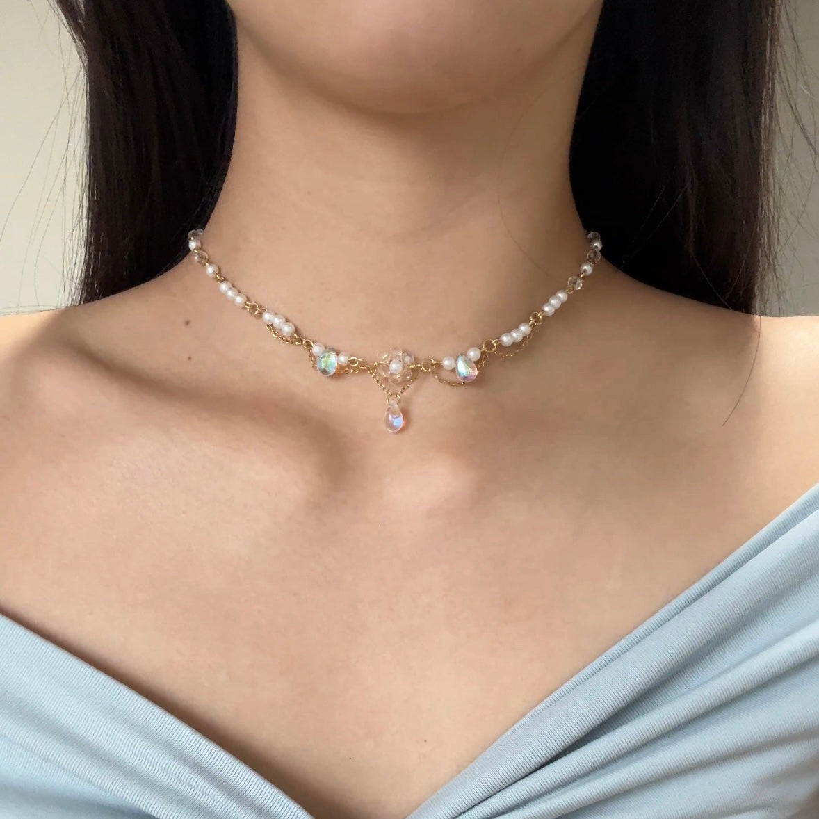 Materials used: stainless steel chains gold plated wire and jump rings, pearls, crystal clear beads, pressed glass tear drop beads. 14k gold plated earring studs