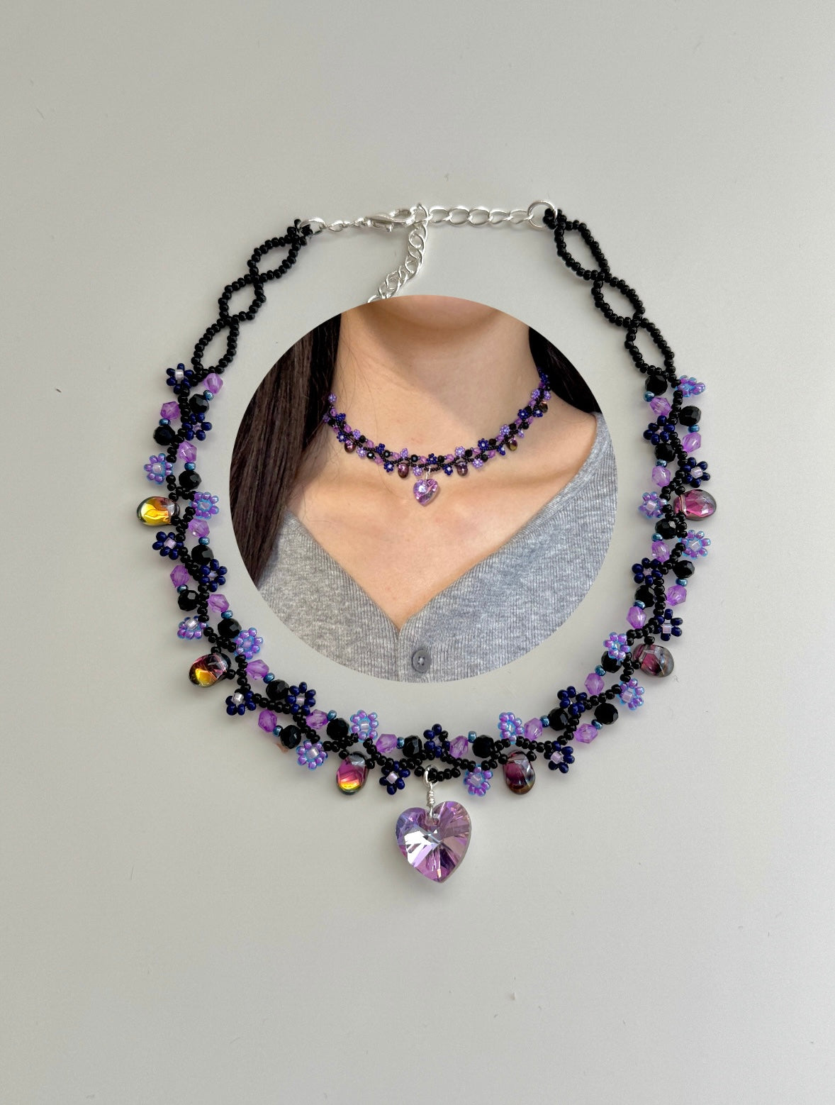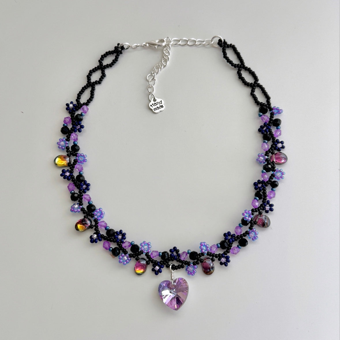 Materials used: stainless steel extension chain and clasp, crystal beads, pressed glass tear drop beads, Swarovski heart gem, miyuki seed beads.