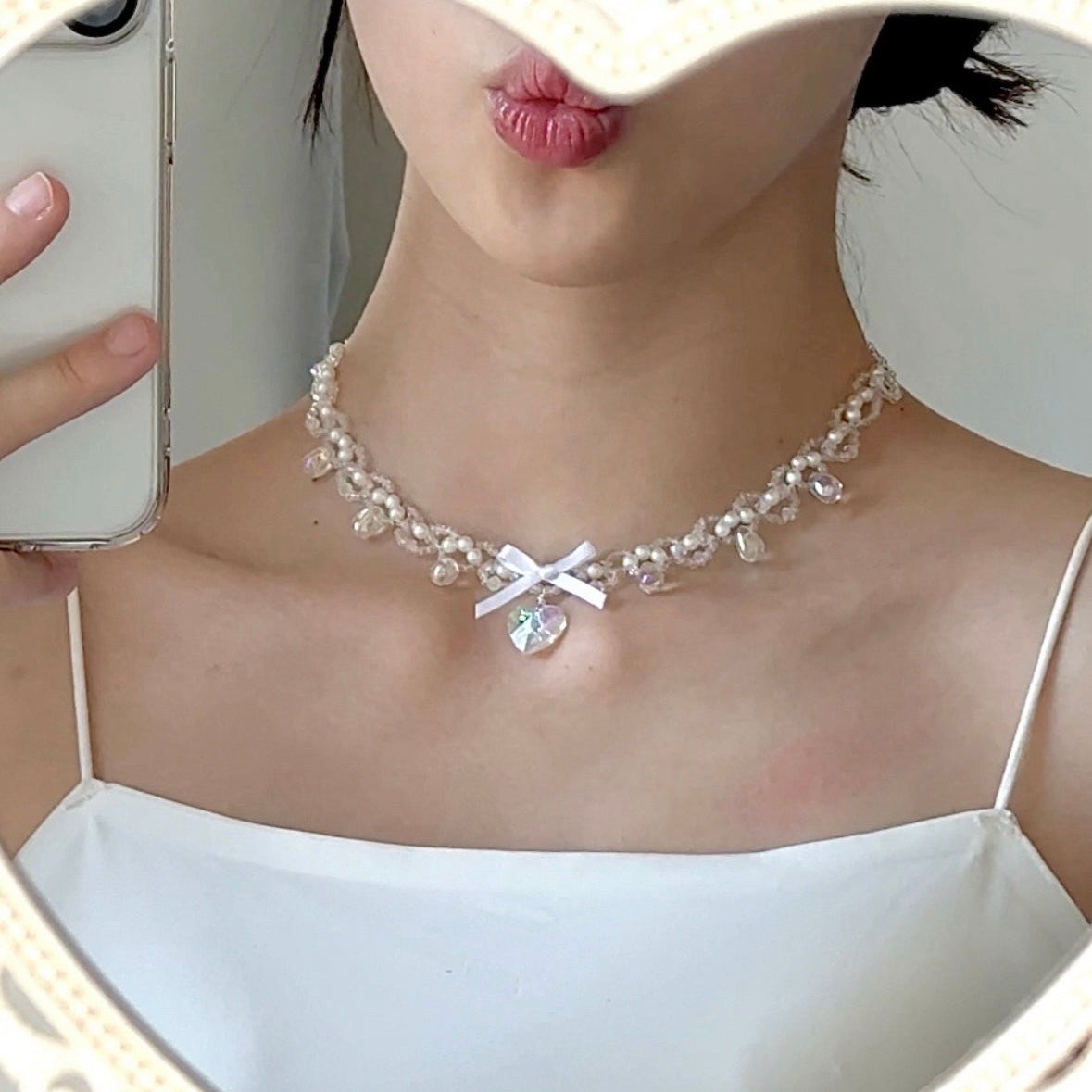 - Handmade with miyuki seed bead, pressed glass beads, pressed glass tear drop, Swarovski crystal bead & heart, satin ribbon, tarnish resistant chain.
