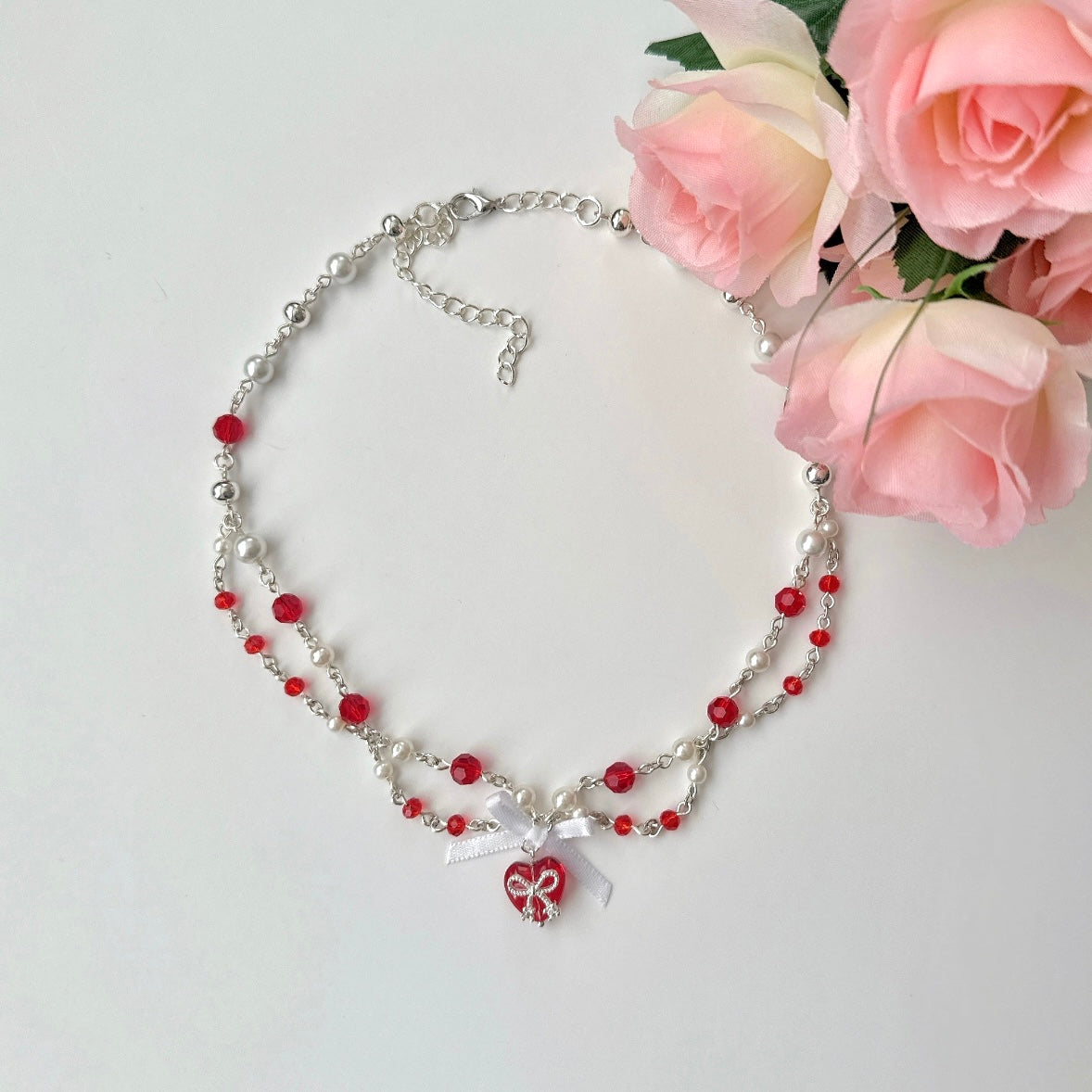 - Handmade with pressed crystal beads, pearls, silver sterling charm, satin ribbon, tarnish resistant chain, stainless steel wire.